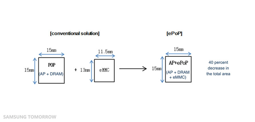 Samsung’s new ePoP takes up 225 square millimetres (15x15mm), just like the mobile application processor. The currently used PoP also measures 15mm x 15mm, but it consists of the mobile processor and DRAM - eMMC is housed in a separate 11.5mm x 13mm package, so the whole platform takes up 374.5 square millimetres. Samsung said ePoP decreases the total area used by approximately 40 percent.